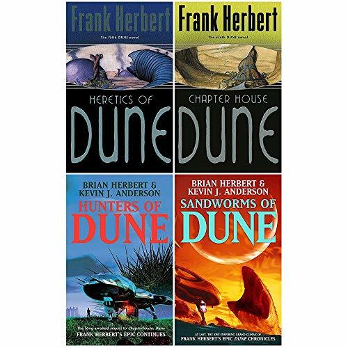 Dune Series 5 to 8 Book : 4 Books Collection Set Includes Titles In This Set:- Heretics of Dune,Chapter House Dune,Hunters of Dune,Sandworms of Dune. Description:- Heretics of Dune From Dune to Rakis to Dune, the wheel turns full circle. From burning desert to green and fertile land and on again to burning desert … the cycle is complete.The people of the Scattering are returning. Amongst them, mysterious and threatening, are the women who call themselves the Honoured Matres, adepts of an ecstatic cult. Chapter House Dune The long-established galactic order is passing. The Honoured Matres, ruthless and all-conquering, have destroyed the planet Dune. In opposition, hard-pressed but still fighting back, the Bene Gesserit sisterhood co-ordinate their resistance from their as-yet undiscovered home world, Chapter House. Hunters of Dune Fleeing from the monstrous Honored Matres – dark counterparts of the Bene Gesserit Sisterhood – Duncan Idaho, the military genius Bashar Miles Teg, a woman named Sheeana who can talk to sandworms, and a group of desperate refugees explore the boundaries of the universe. Sandworms of Dune As the no-ship Ithaca flees through space, the heroes of HUNTERS OF DUNE finally meet the Enemy who followed the violent fanatics, the Honored Matres, back to their universe.The thinking machines vanquished by Serena Butler’s jihad were not destroyed, only driven into exile – and now, tens of thousands of years later, they are back. Can the resurrected heroes on board the Ithaca save our race from annihilation?